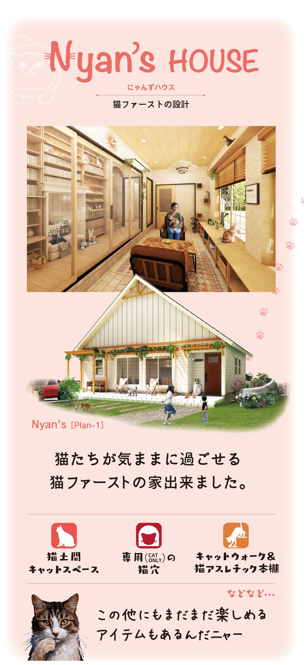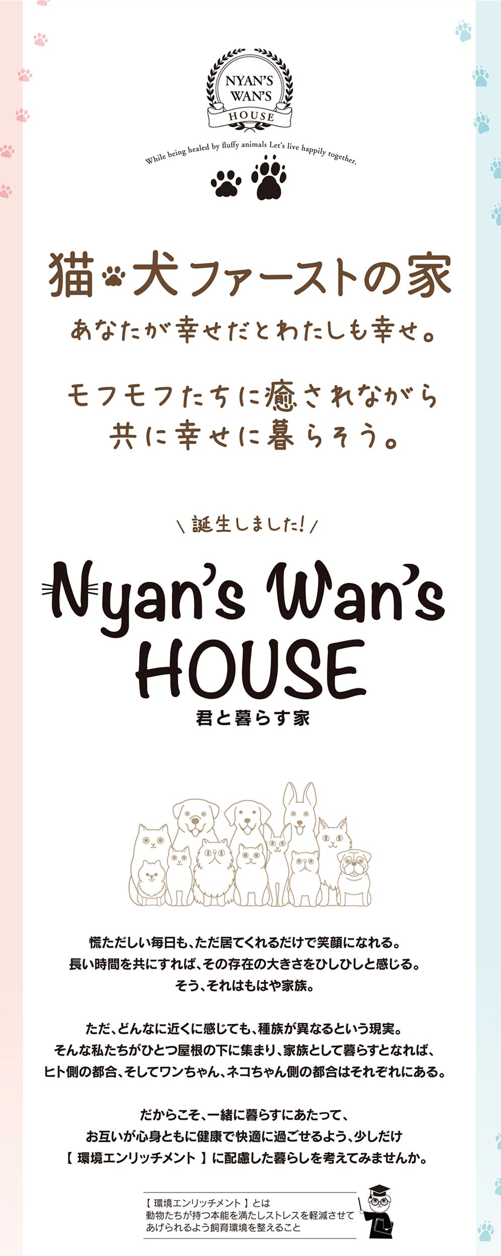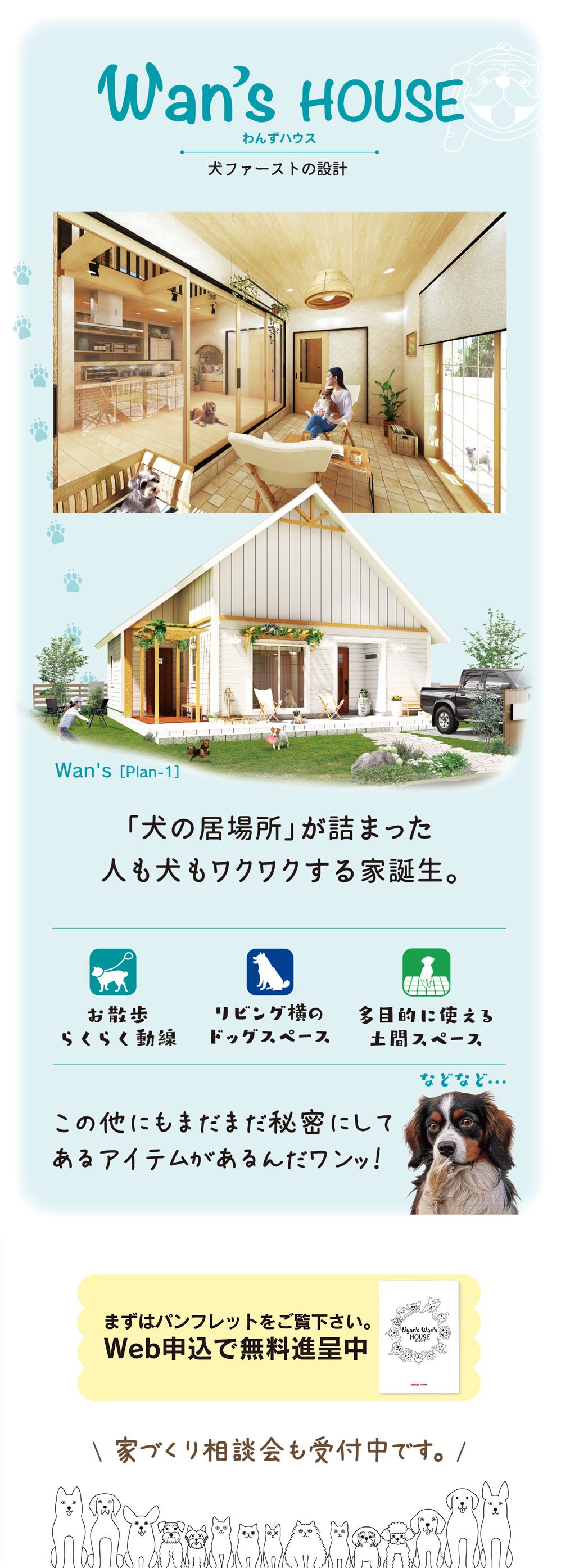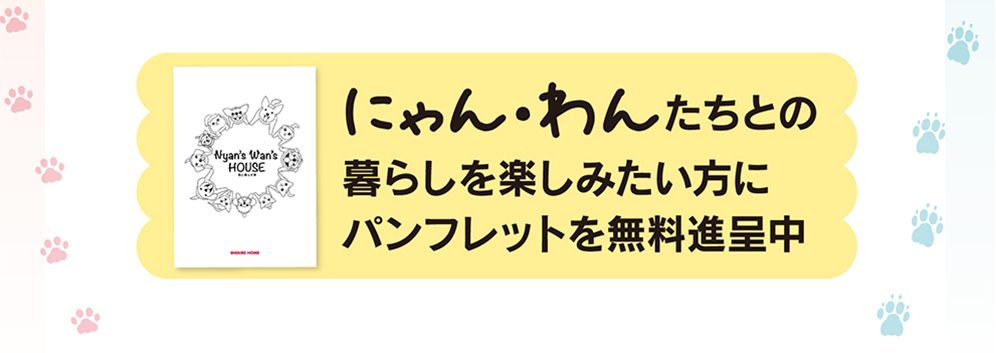 モフモフたちに癒やされながらともに幸せに暮らす【にゃんずわんずハウス】が誕生。家族みんなが幸せに暮らせる家づくりをお考えの方にパンフレットを差し上げます。まずはお気軽にお問い合わせ下さい。