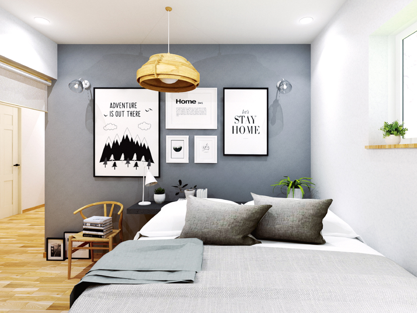 ベッドのファブリックを白とグレーに統一することで、清潔感のあるリッチな空間を演出。ベッド横や窓際に植物を置くことで、癒しの効果も高まる。